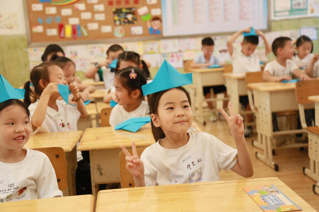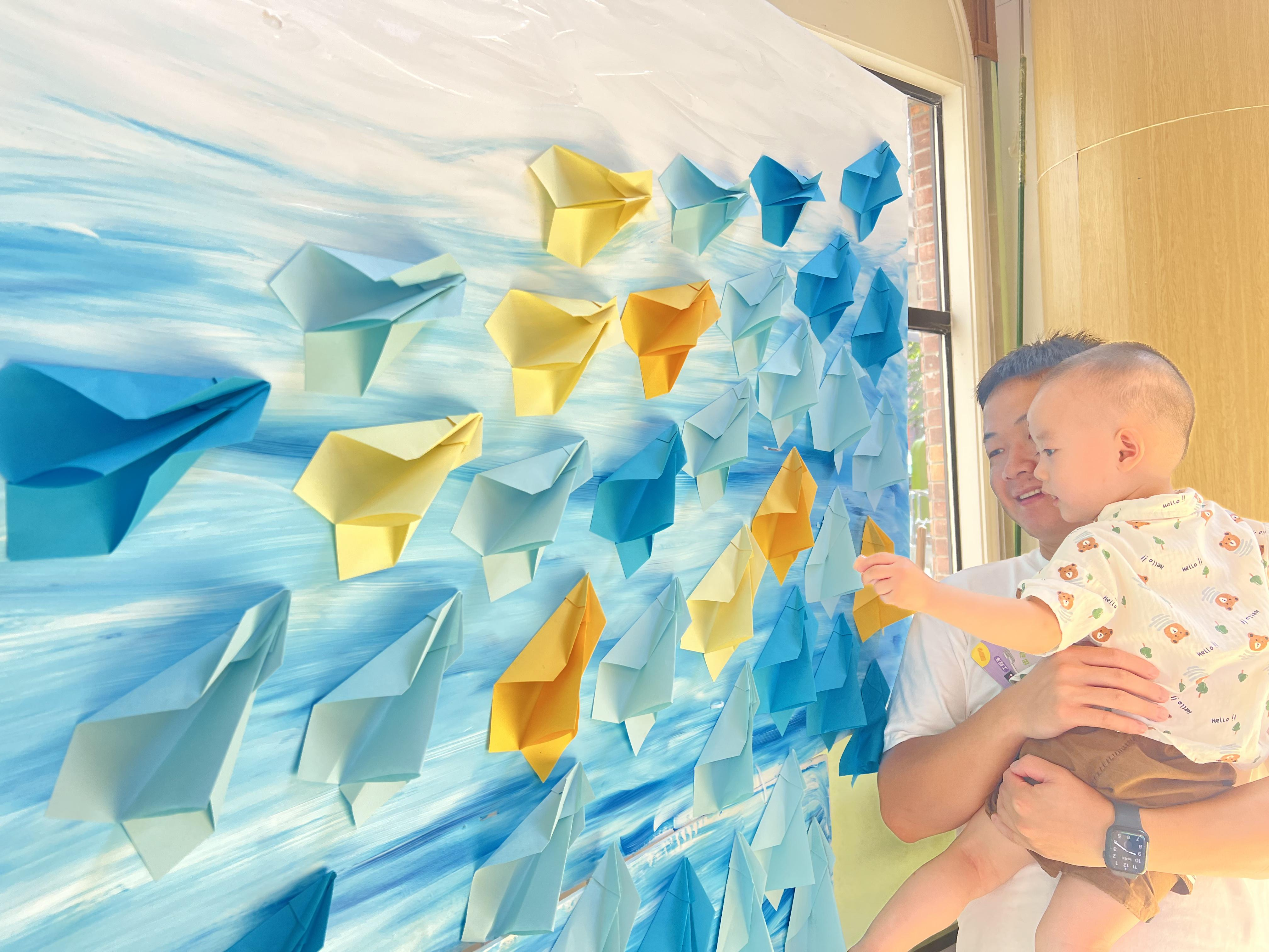 车谷育杰幼儿园孩子们在教师助力下,用印章为纸飞机墙上的专属小飞机“盖印”,让梦想随纸飞机即刻起航。