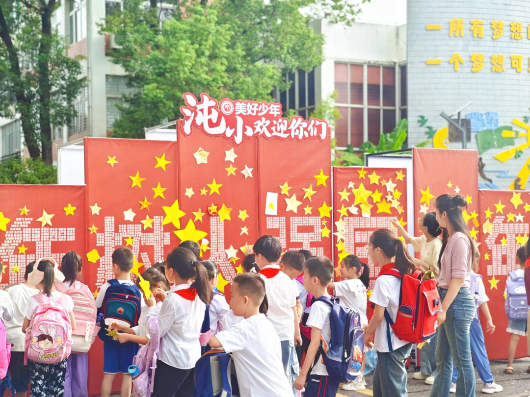育欣小学以“欣欣学子进校园,快乐探秘启新程”为主题,为一年级新生举办游园活动,小学生们打卡“浪浪山”主题墙。