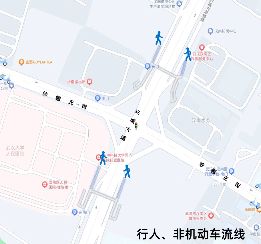 (四)行人、非机动车行经纱帽正街路口、横穿兴城大道,需要通行路口两侧的人行过街天桥,禁止直接横穿路口。
