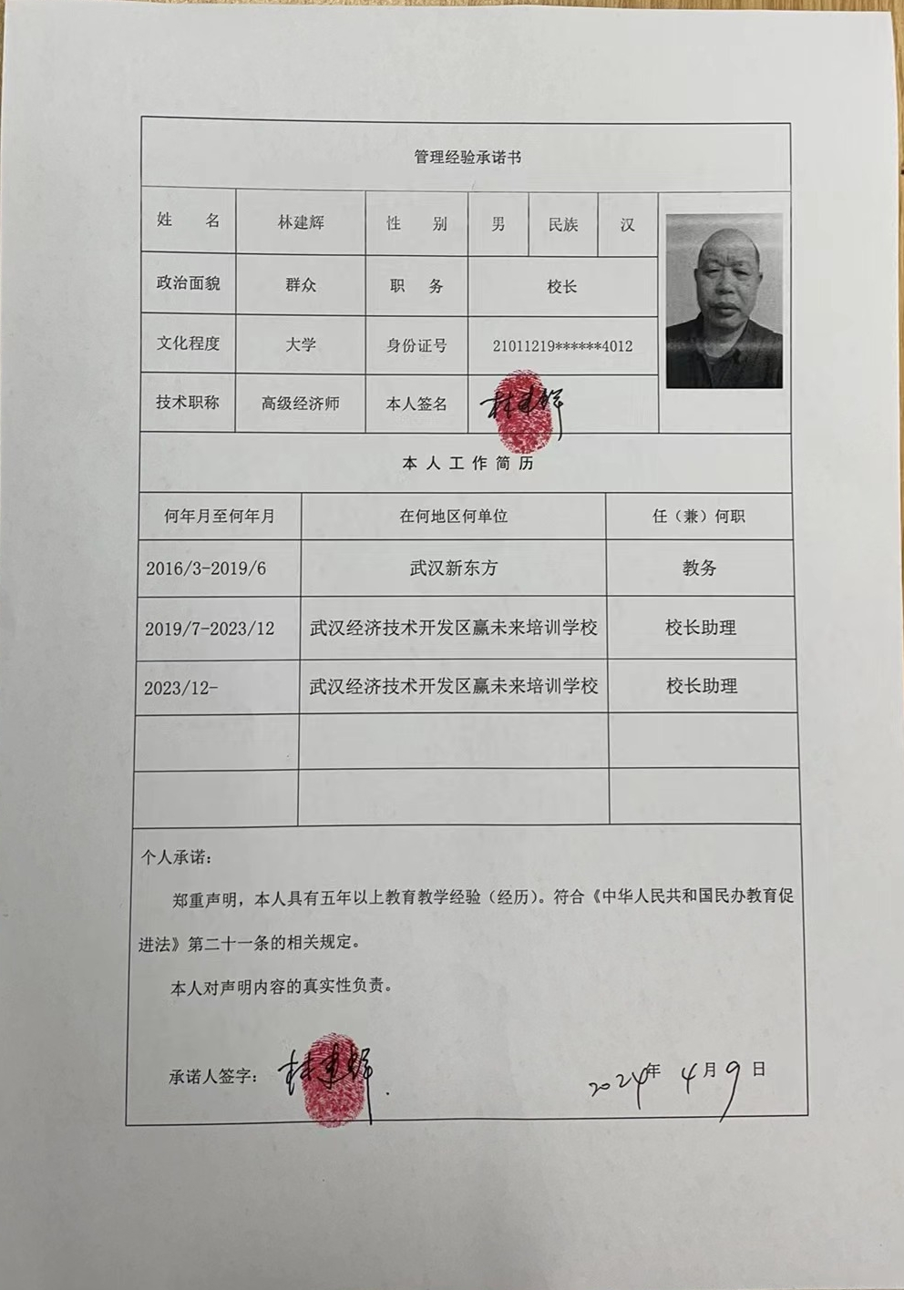 因武汉经济技术开发区赢未来培训学校有限公司需变更校长及理事会成员。原理事会具有五年以上教育教学经验的人员不再担任该机构理会成员职务。根据《中华人民共和国民办教育促进法》第二十一条之规定:学校理事会或者董事会由举办者或者其代表、校长、教职工代表等人员组成。其中三分之一以上的理事或者董事应当具有五年以上教育教学经验。现将董(理)事会成员林建辉(身份证号:21011219******4012)、校长林建辉(身份证号:21011219******4012)的个人教育教学经验简历进行公示。