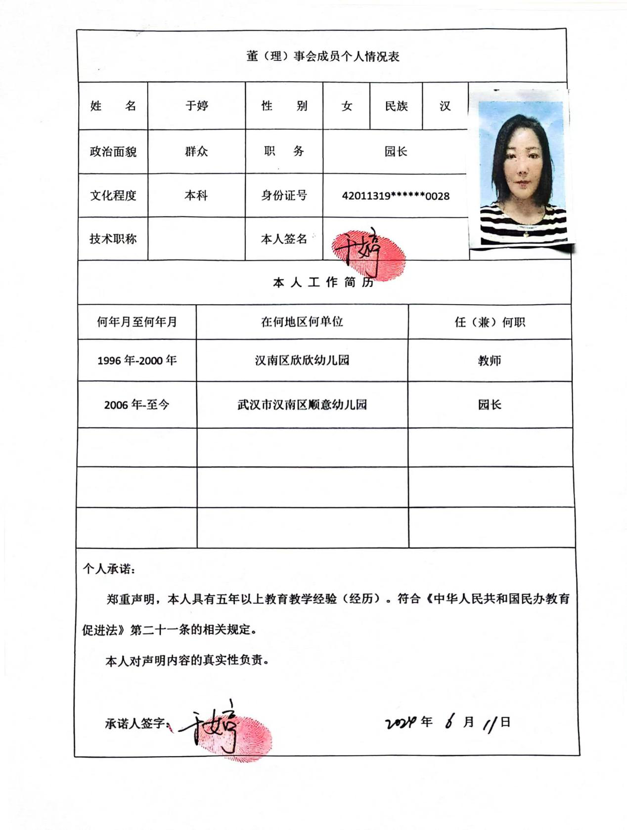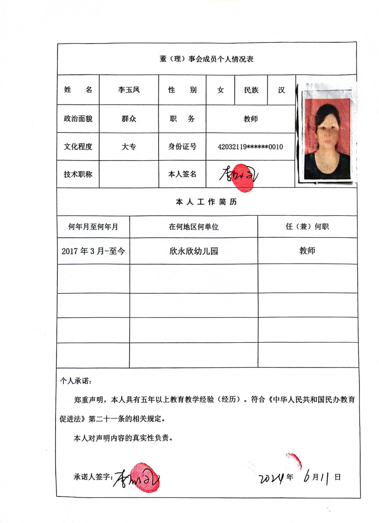 根据《中华人民共和国民办教育促进法》第二十一条之规定:学校理事会或者董事会由举办者或者其代表、校长、教职工代表等人员组成。其中三分之一以上的理事或者董事应当具有五年以上教育教学经验。因武汉经济技术开发区(汉南区)欣永欣幼儿园(筹)需办理《中华人民共和国办学许可证》,现将董(理)事会成员李玉凤(身份证号:42032119******0100)园长于婷(身份证号:42011319******0028)的个人教育教学经验简历进行公示。
