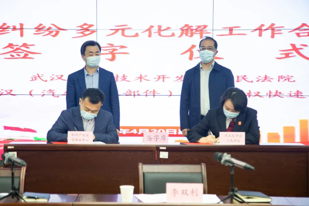 经开区人民法院负责人重点介绍了近年法院营造法治化营商环境和知识产权审判工作,经开区工委委员刘茂华介绍了近期全区工业经济发展和知识产权保护等相关工作。座谈会上,经开人民法院副院长张云、武汉快维中心主任唐传勇共同签署《武汉经济技术开发区人民法院与中国武汉(汽车及零部件)知识产权快速维权中心知识产权纠纷多元化解工作合作备忘录》(以下简称《备忘录》)。