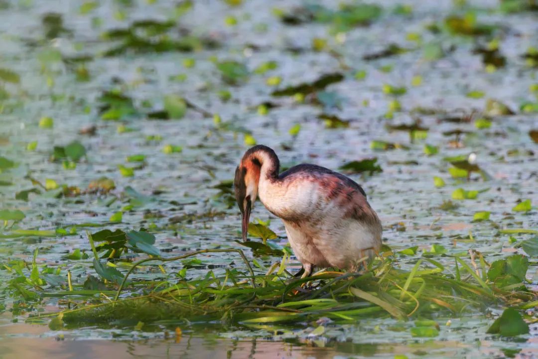 ▲凤头䴙䴘正在万家湖公园湖面整理繁殖巢。
