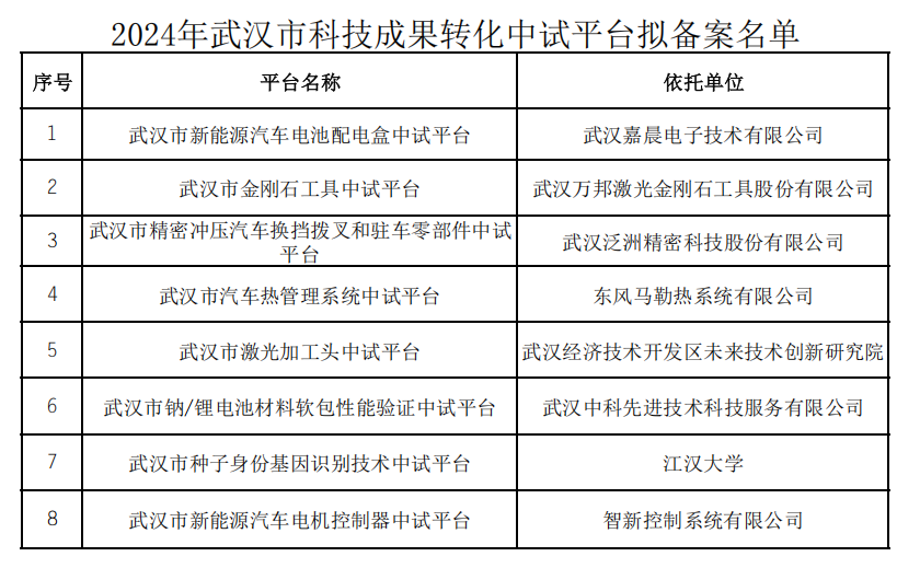 近日,市科技局公布了2024年武汉市科技成果转化中试平台拟备案名单,江汉大学、武汉嘉晨电子、武汉万邦激光金刚石等8家科技成果转化中试平台入选,占全市1/4。至此,武汉经开区科技成果转化中试平台达30家。