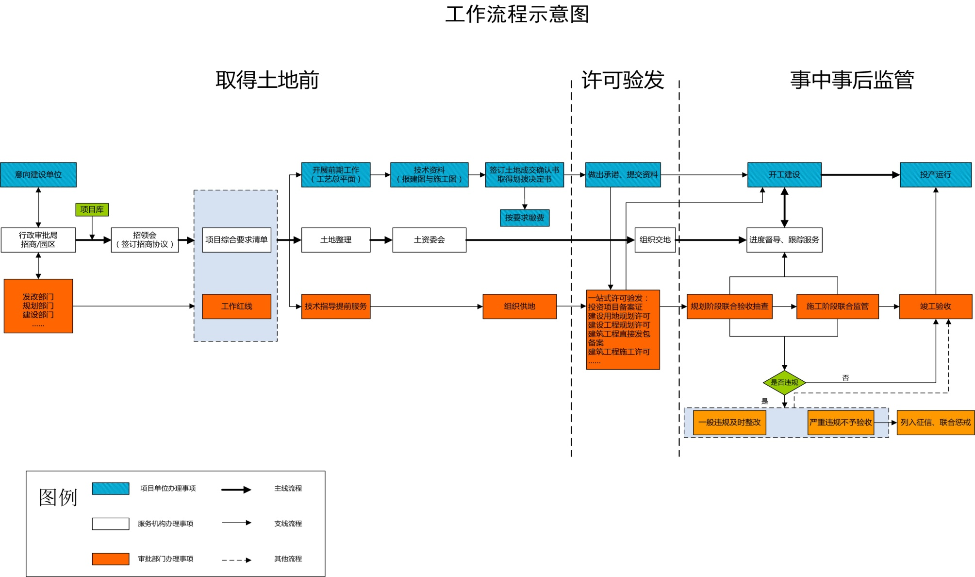 招商协议签订之后,区行政审批局组织区发改局、自然资源和规划局、住建局、经信局、生态环境分局、水务湖泊局等相关部门,拟定项目在技术、政策等方面的要求,形成项目“综合要求清单”。区行政审批局负责将汇总的“综合要求清单”和“工作红线”提供给意向建设单位。